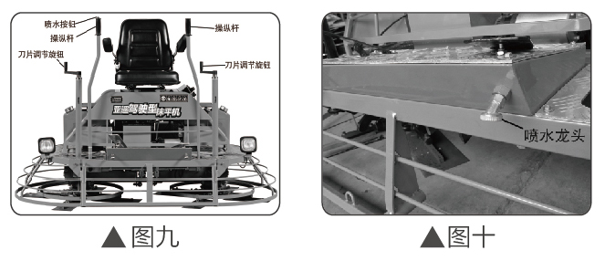 ③ 水泵開(kāi)關(guān)裝在右手操作桿頂端,只要一按水泵開(kāi)關(guān)按鈕,水泵就會(huì)自動(dòng)噴水。(見(jiàn)圖九、圖十)我們建議參照我們制定的檢查標(biāo)準(zhǔn)對(duì)機(jī)器進(jìn)行檢查。每天檢查項(xiàng)目(工作5-10小時(shí)后):檢查變速箱渦輪蝸桿油是否有損耗(如圖二);檢查引擎潤(rùn)滑油是否有損耗(如圖三);檢查電器線(xiàn)路是否有問(wèn)題。(機(jī)器上的計(jì)時(shí)器可以提供工作時(shí)間)