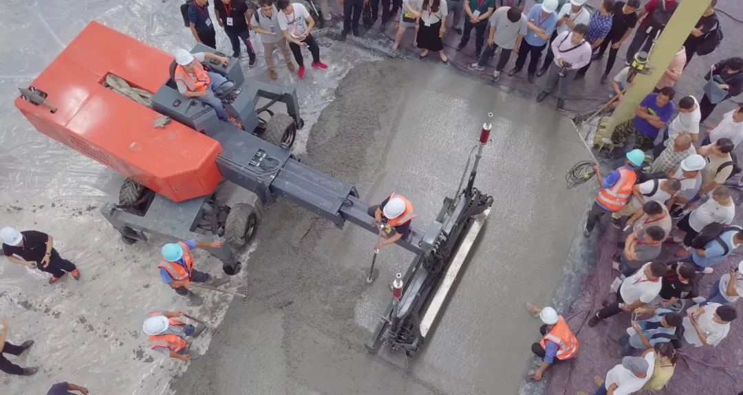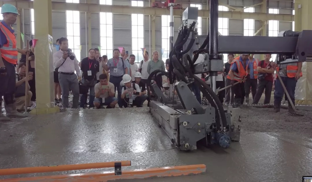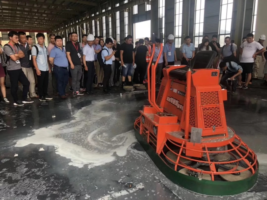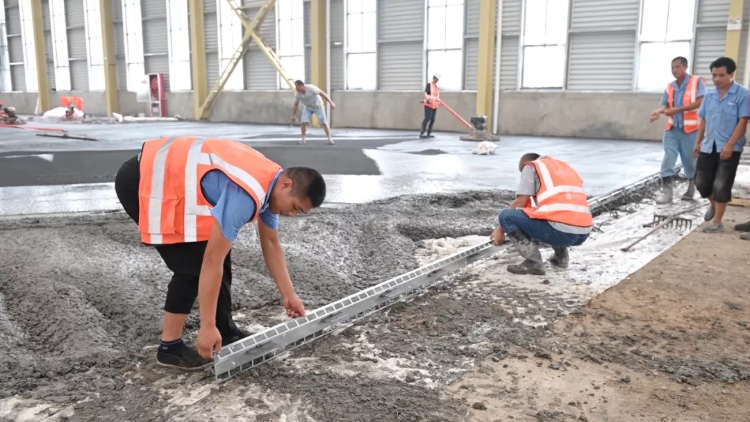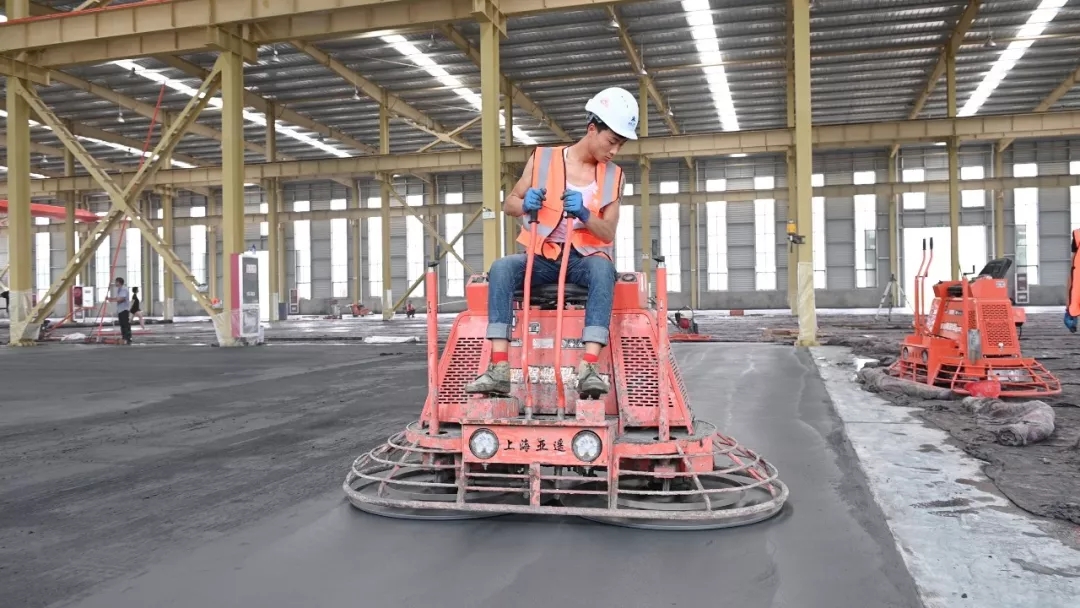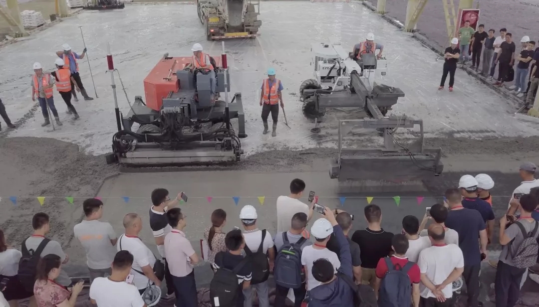 此次施工演示在亞遙即將竣工的一期廠房內,廠房地坪總面積約6000多平米。展熠工程作為施工商,使用亞遙全系列產品搭配朔馬珞STS-11M撒料機施工,材料使用科蘭T25干撒合金耐磨骨料和美爾林ML300鋼纖維,美國施貝密封固化劑。混凝土厚度20cm,現場混凝土坍落度約160mm。
